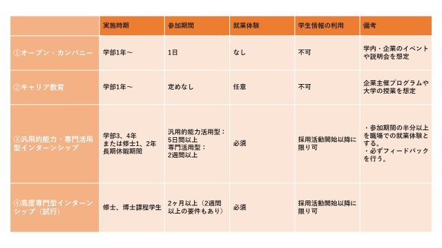 これまでのインターンシップは、「学生が在学中に自らの専攻、将来のキャリアに関連した就業体験を行うこと」という大まかな定義でしたが、4つの類型に整理されることになりました。