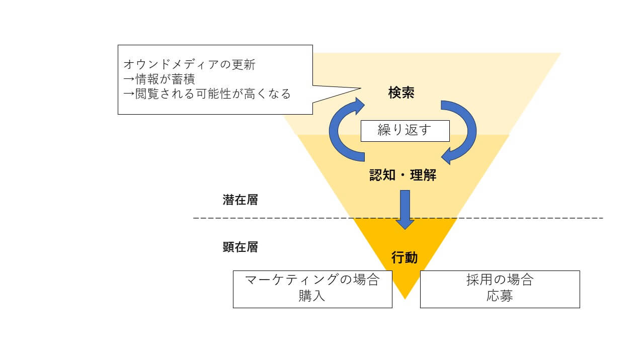 検索結果にもとづき商品やサービス、企業を認知し、理解を深めます。オウンドメディアは日々更新されるため、ほかの気になるコンテンツに派生したり、新たに検索した内容を閲覧することによってさらに理解を深めていきます。こうして、検索と認知・理解を繰り返します。