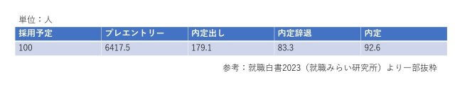 就職白書2023によると、採用予定人数を100とした場合、各段階の人数は以下の表のような結果となっています。