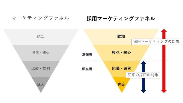 採用マーケティングでは、従来の採用よりも広くターゲットを設定します。従来の採用では、ファネルのうち応募・選考に至った求職顕在層を対象としていました。つまり、就職・転職の意向が高い人に、どのように入社してもらうかに焦点が置かれていたのです。
