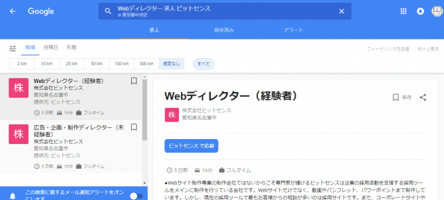 以下の画像は、実際に「Google しごと検索」に掲載された弊社採用サイトの求人のスクリーンショットです。