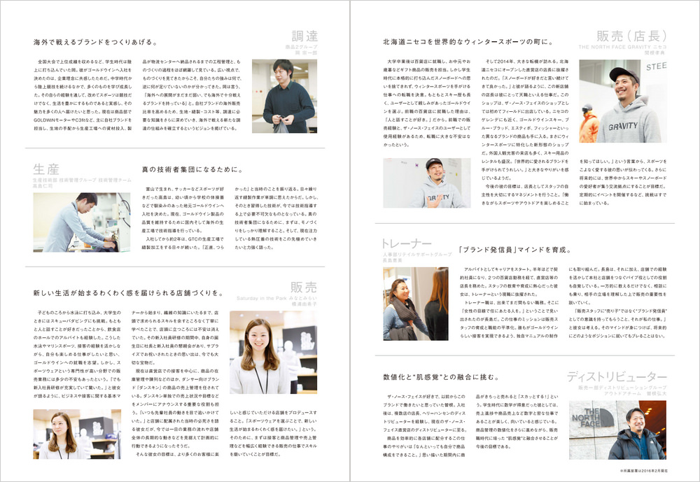 弊社がGOLDWIN様の採用支援を始めたのは2008年。当時クライアント様は、「学生に自社をどう伝えたらよいか」悩んでいました。GOLDWIN様は、メーカーでありながら販売店を展開していたり、マルチブランド戦略を推進しているなど、競合にはない強みがたくさんある会社。けれども業界知識のない学生には、それらの魅力が伝わっていない状況でした。そのため、伝えるべき魅力を一つのツールにすべて詰め込むのではなく、「事業」「職場」「社員」など観点ごとに複数のツールに切り分けて整理し、それらを複合的に連動させる採用プロモーションを展開しました。また表現手法としては、社員の言葉を通して伝えることに重きを置き、学生の共感を得やすい演出を心掛けました。