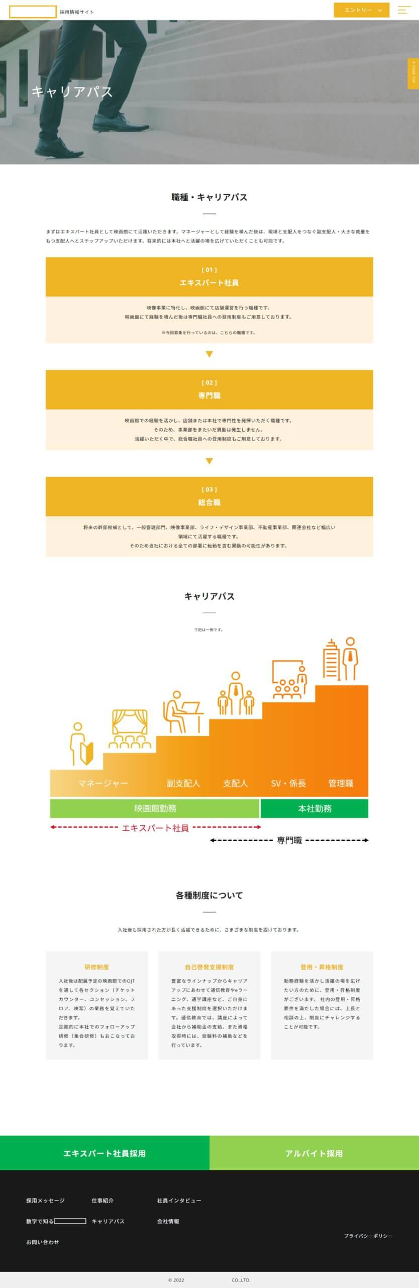 採用サイトパッケージ「RECS」を使用し、映画館運営の採用サイトを制作しました。お客様が新たに策定された理念を表現することと、映画館らしいワクワク感をテーマに、デザインを作成しています。「RECS」の基本パッケージには無い、スクロールエフェクトを付与することで、パッケージサイトながらオリジナリティのあるTOPページに仕上げました。