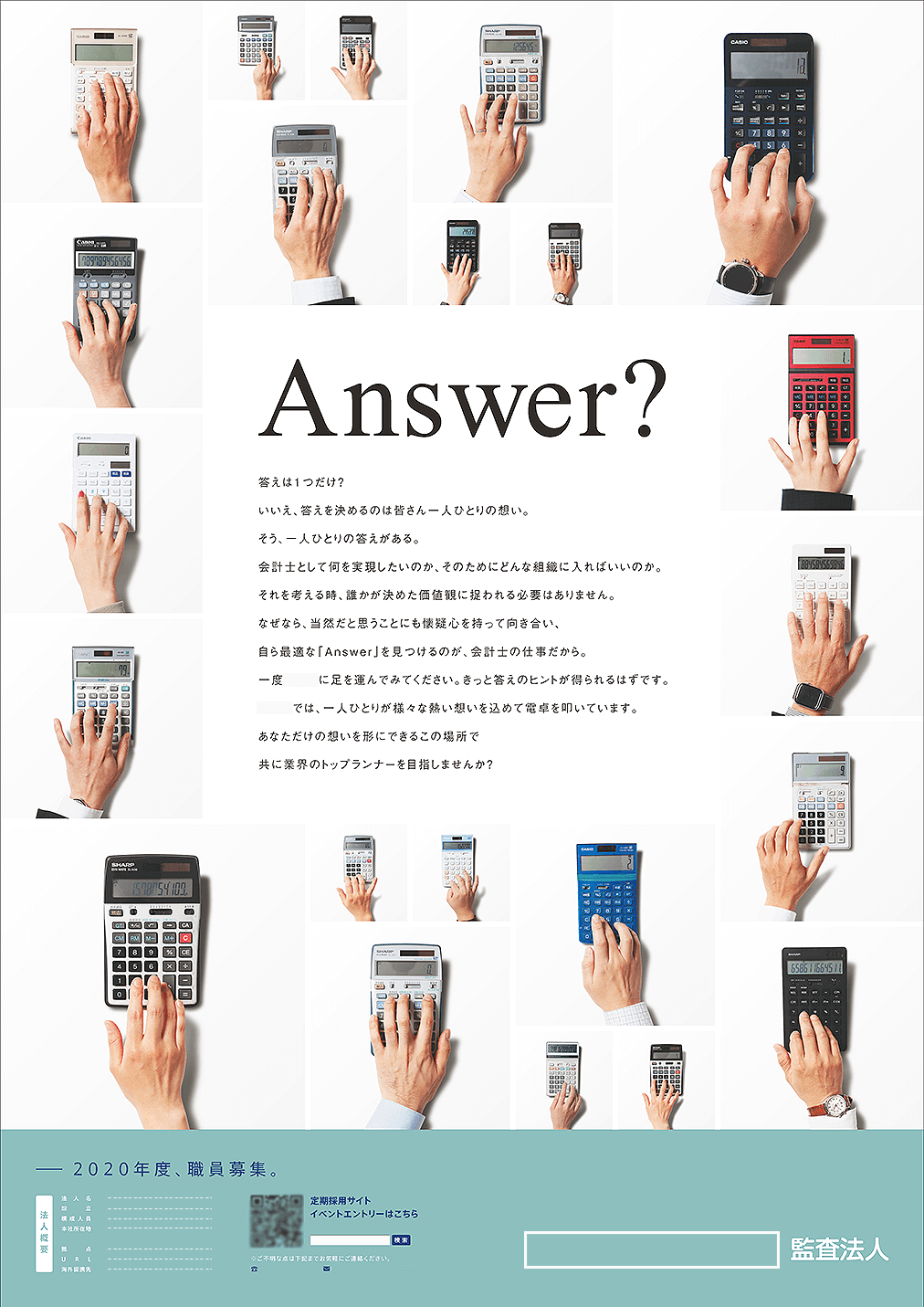 会計士の必需品である電卓を叩く手をモチーフに、シンプルながらもインパクトのあるビジュアルとしました。「答えは一つではない」「一人ひとりが様々な想いで電卓を叩いている」という、キャッチコピーに込めた思いを表現したデザインです。