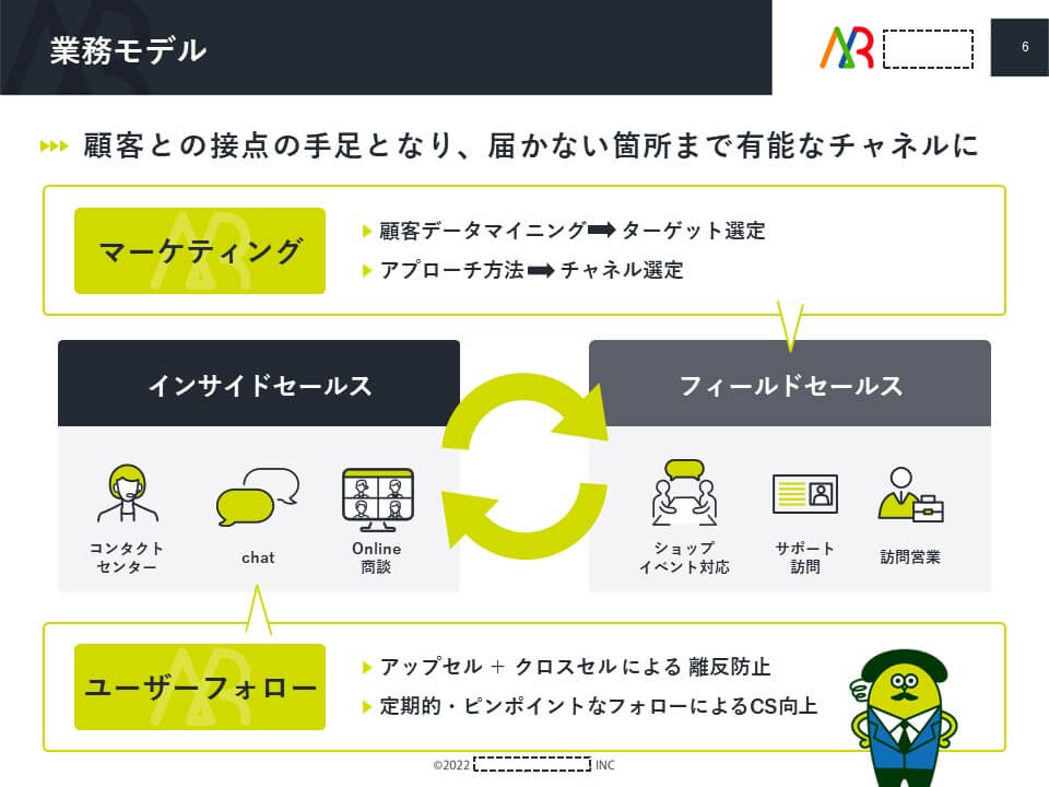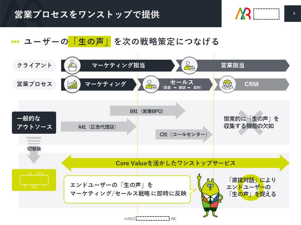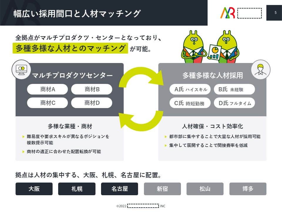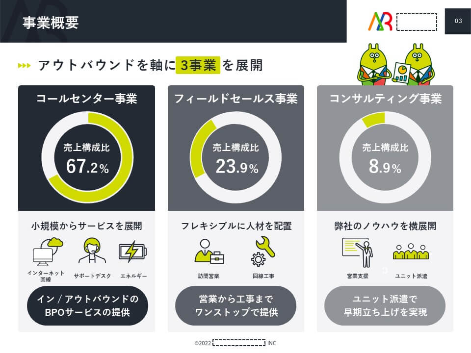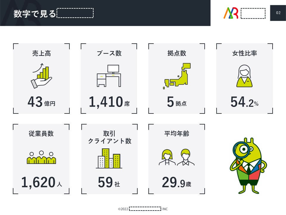 BtoB向けの会社説明資料を既存資料からデザインはポップに、構成はよりわかりやすくしたいという要望がありました。中面は既存資料のシンプル目なデザインから一新し、企業キャラクターをところどころに配置し、イラストも使用することでポップさが出るように制作しました。また、提案先クライアントは大手が多いため、会社説明資料としては読みやすいものになるよう、フォントはポップさを出さないものをチョイスしました。