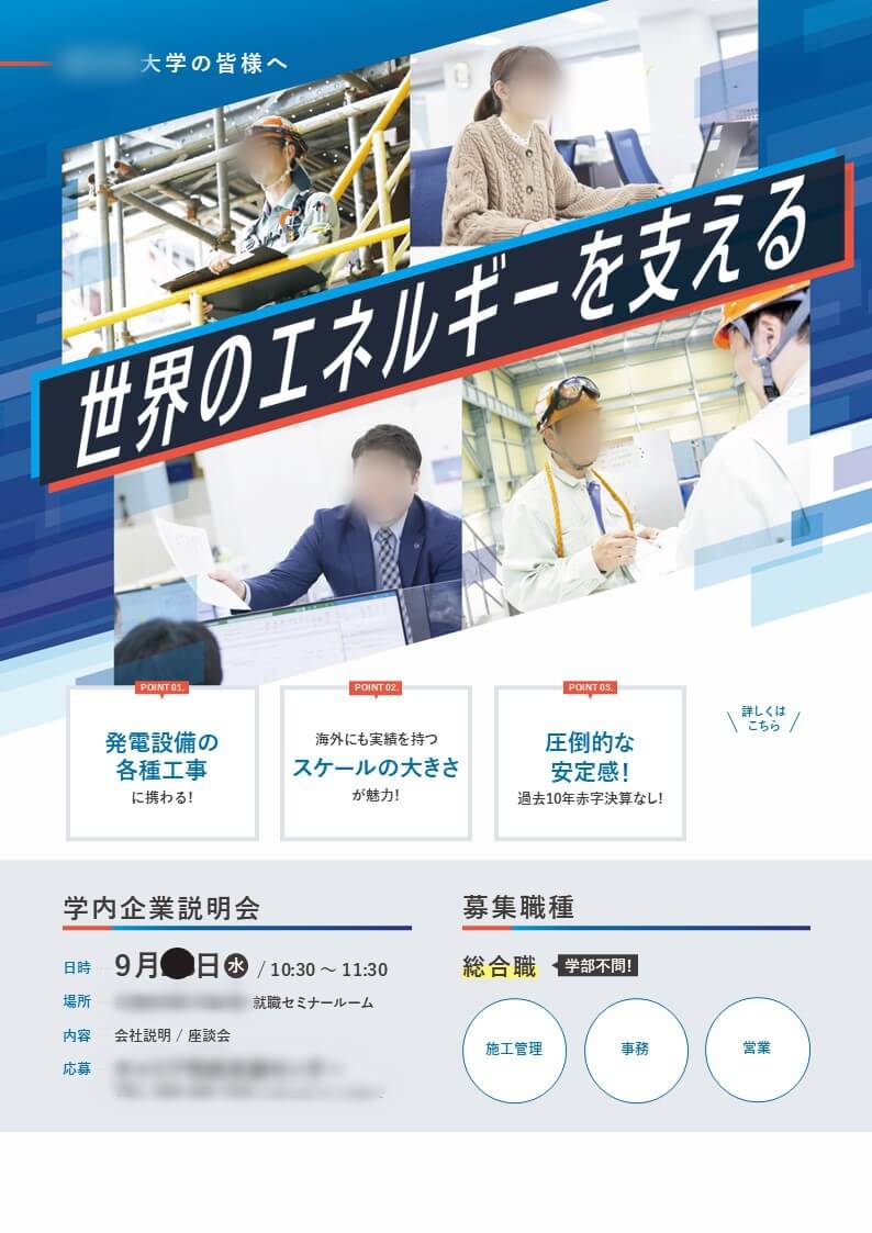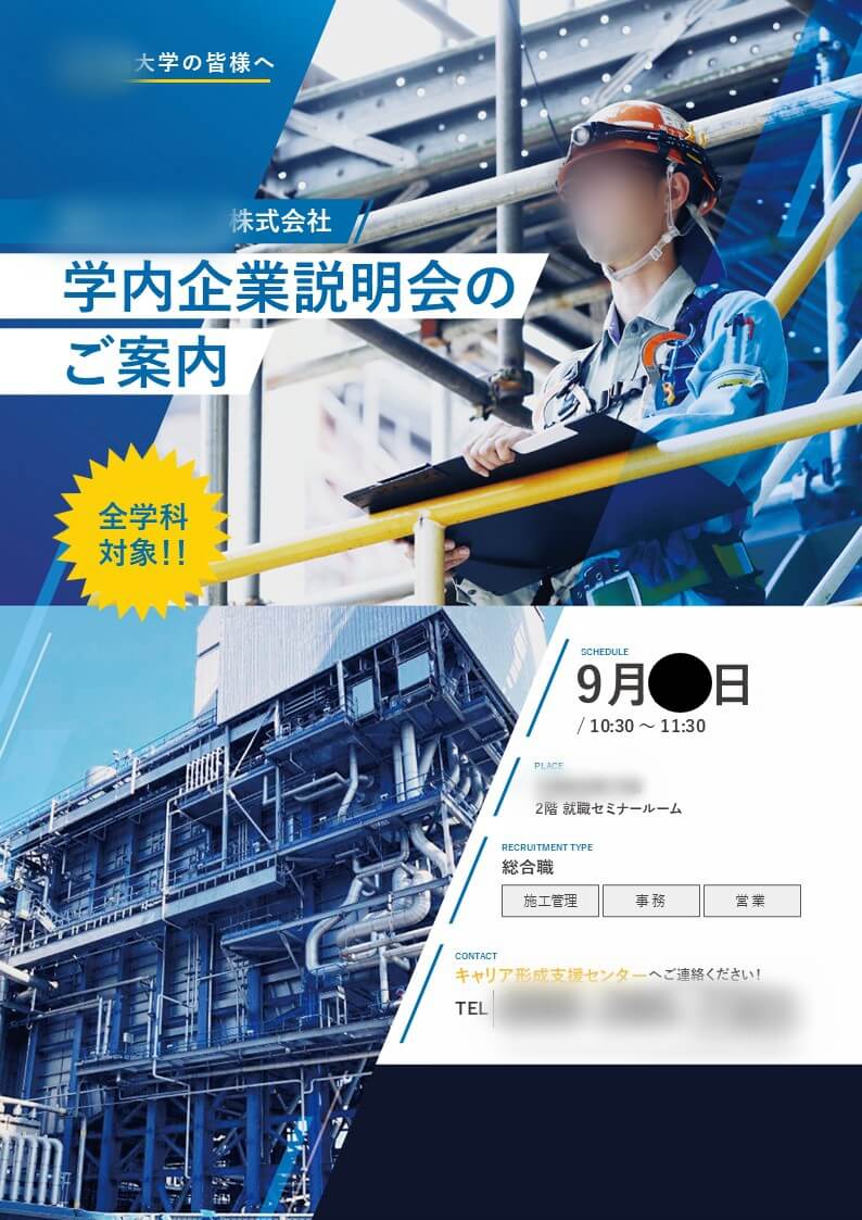 大学に配布する説明会告知チラシを2パターン制作。 「今までは内製していたがデザイン性を高めたい」というご要望を受け、男子学生に刺さるような、さわやか且つかっこよさのあるデザインを目指しました。