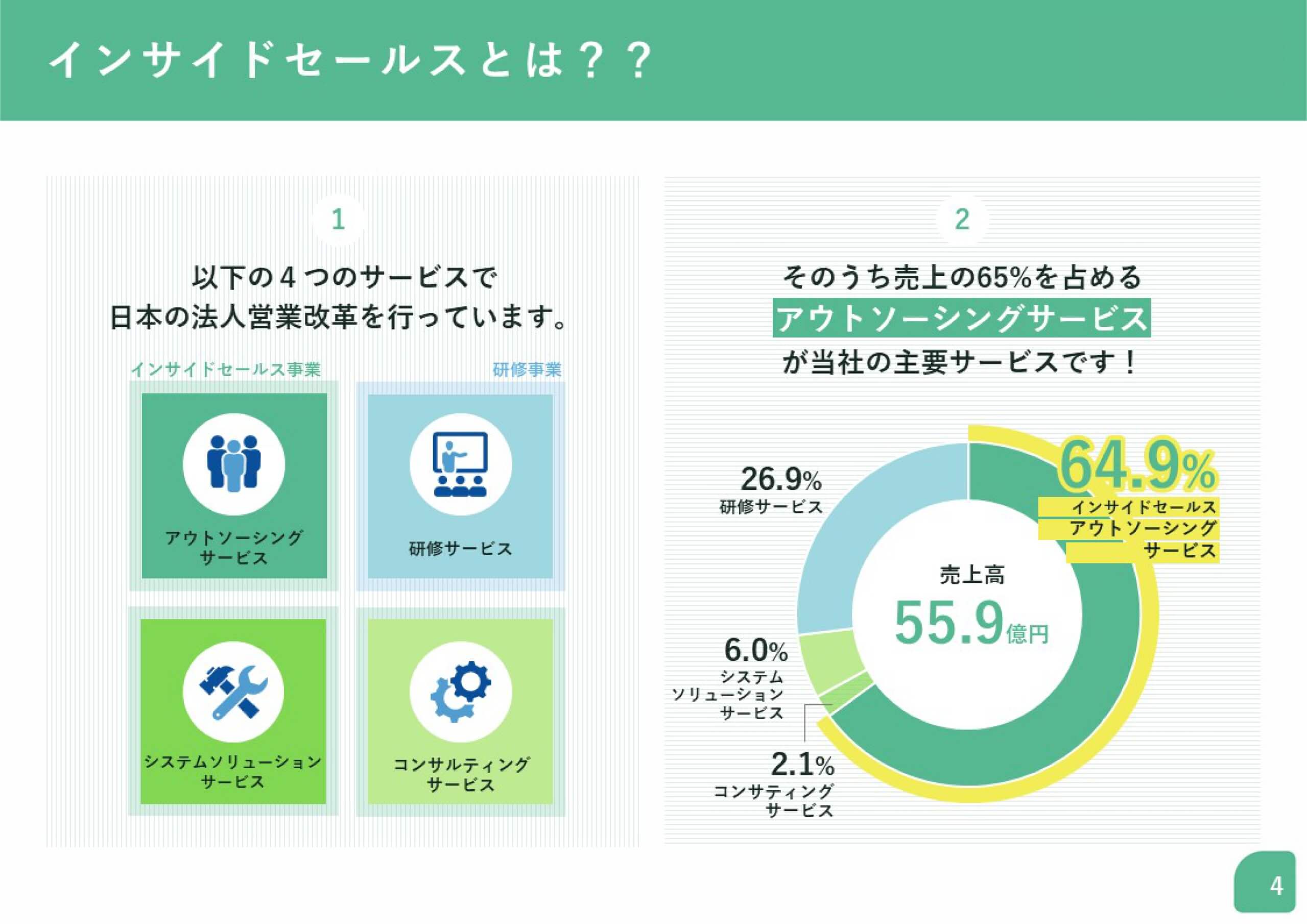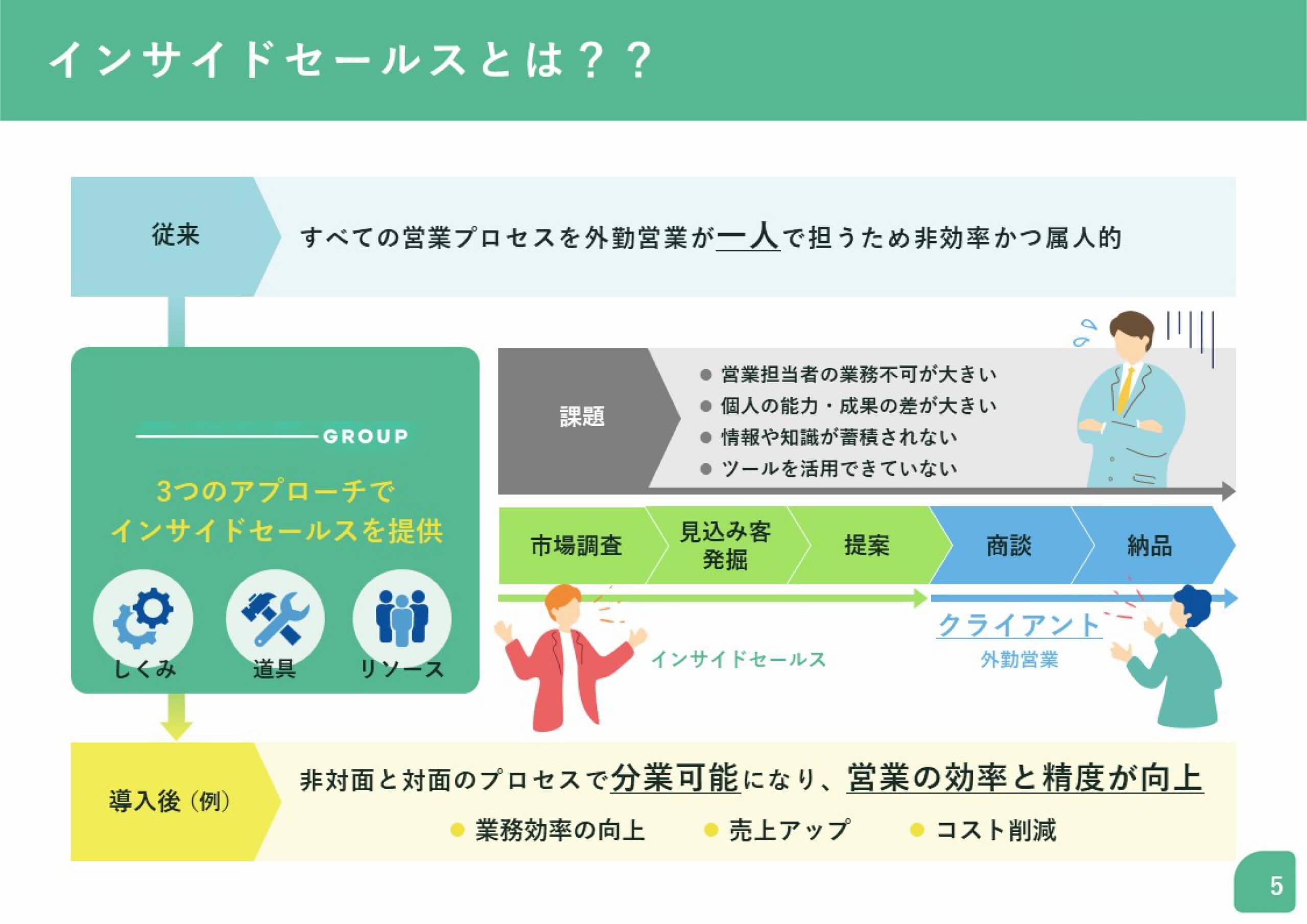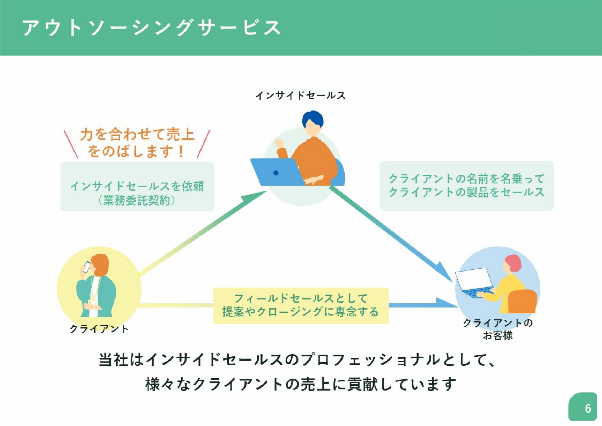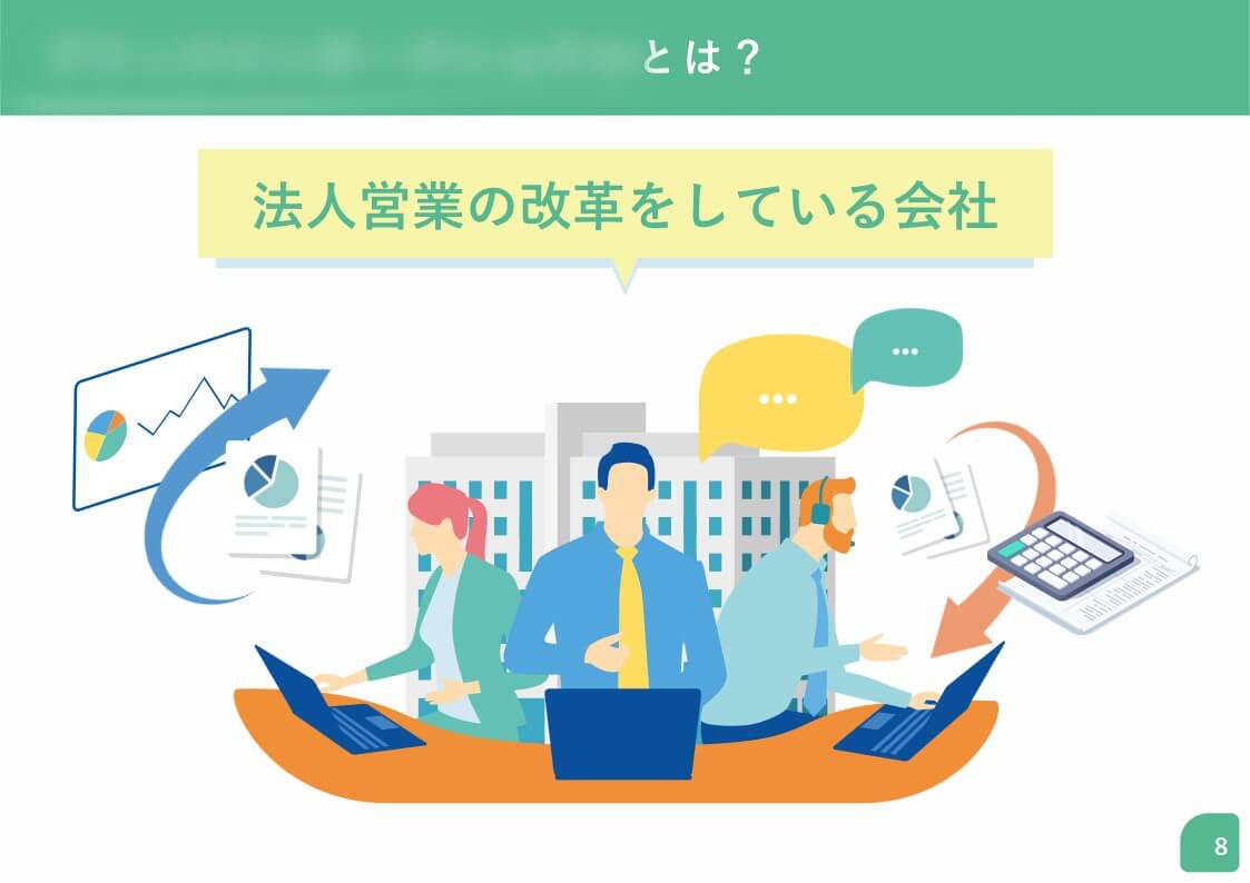 インサイドセールスという一見なじみのない仕事をわかりやすく伝えるための資料です。 明るく楽しそうな営業をおこなっている印象を与えるため、鮮やかな色合いで制作しました。