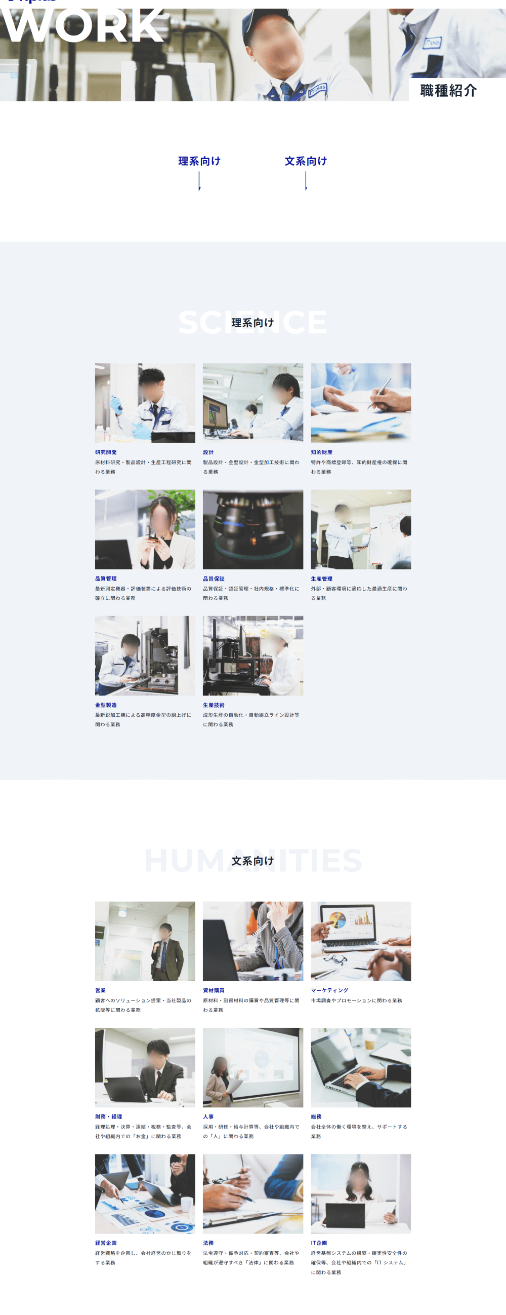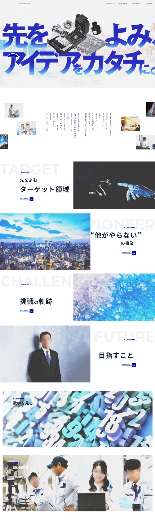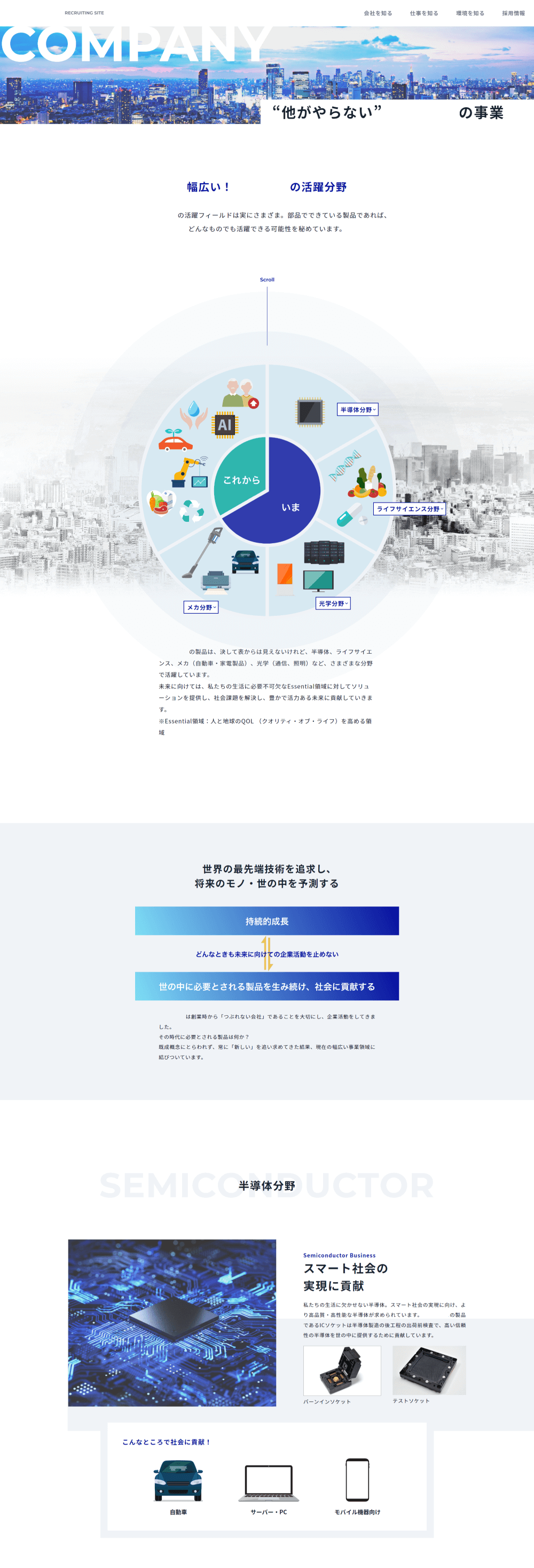 独自性のある事業内容が伝わらず、母集団形成ができないという課題があった企業様。そのため、様々な切り口から事業の魅力を伝えられるようコンテンツを設計。フローティングバナーを設置することで、エントリー導線も確保しています。 また、チャレンジ的な風土を表現するために、テキストや画像を大きくデザインしています。