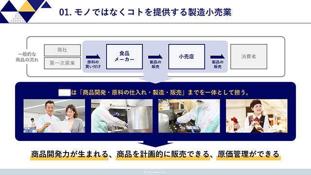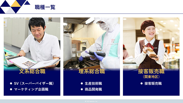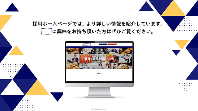 新卒向けのWEB会社説明会映像。リアルで行っていた会社説明会を映像化。映像化にあたって、PPT資料を構成を見直し、デザインを一新。PPTをスライドショー映像にしてプロナレーターのナレーションを付与しました。見やすさ、聞き取りやすさに注力することで、映像でも理解しやすい説明会を目指しました。