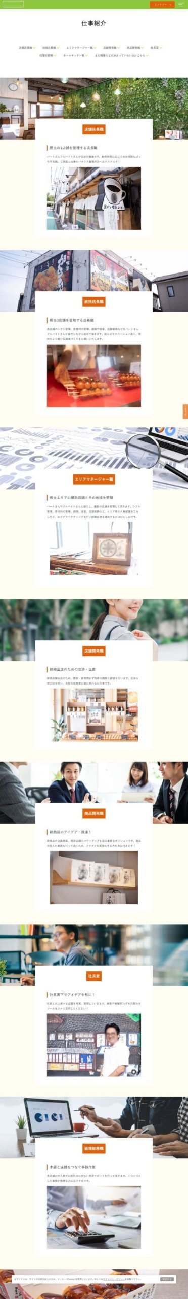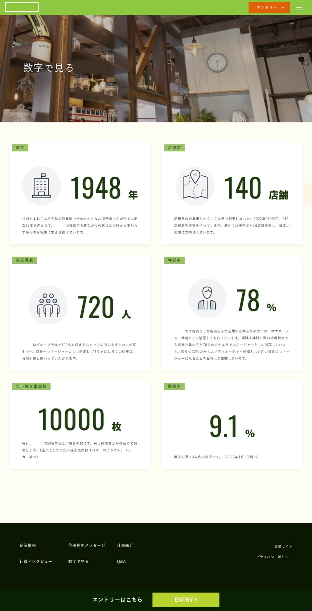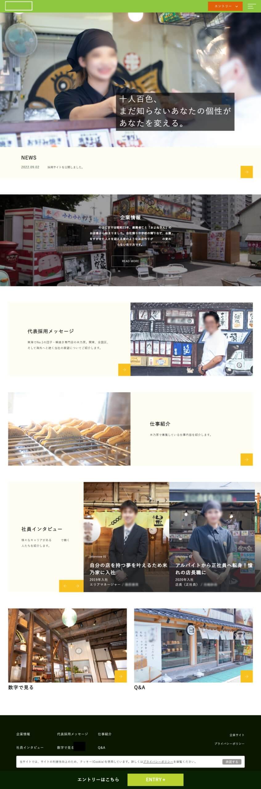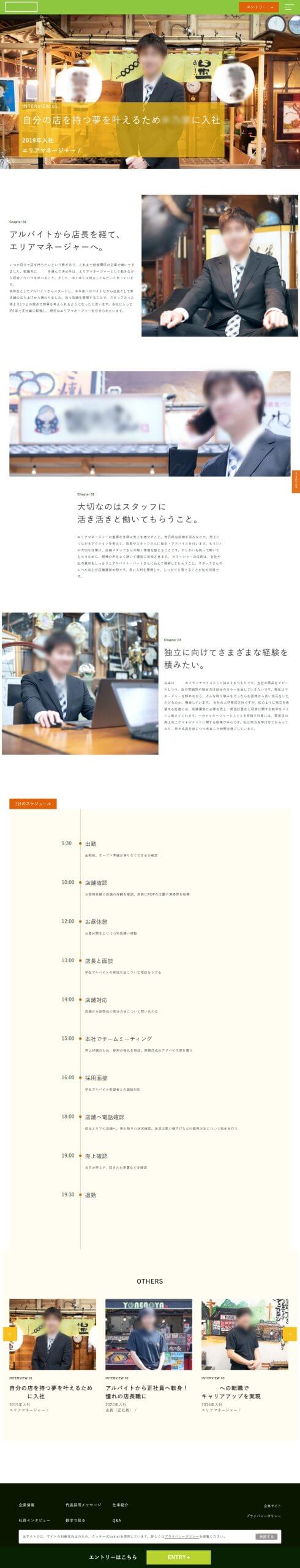 こちらの企業様では幅広い年代の方が働いていますが、特に店舗経営や運営に興味がある、若い求職者の方の採用を促進するための採用サイトを制作しました。社員の独立も積極的に後押ししていることを、社員インタビューや代表メッセージを通じて、若い世代の方が入社後のステップアップのイメージをリアルに思い描けるよう掲載しました。