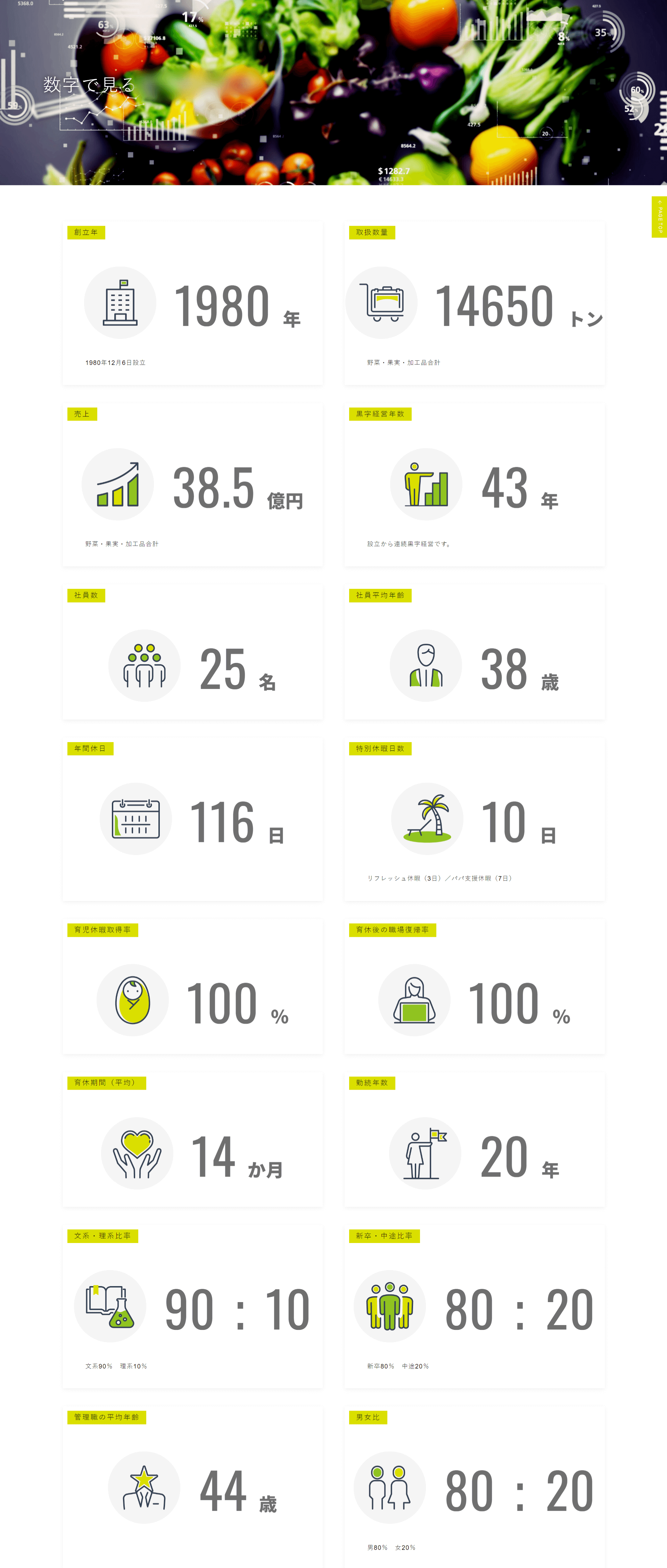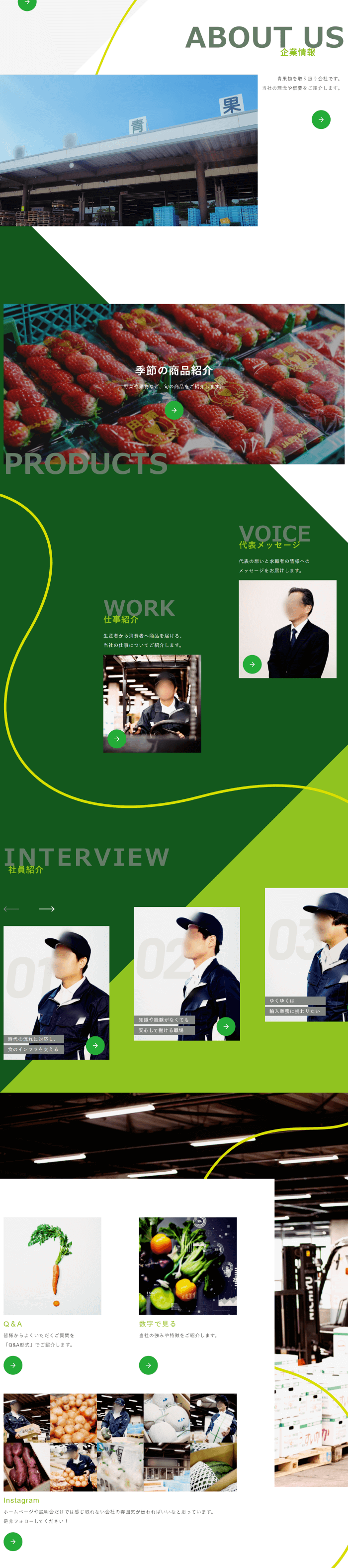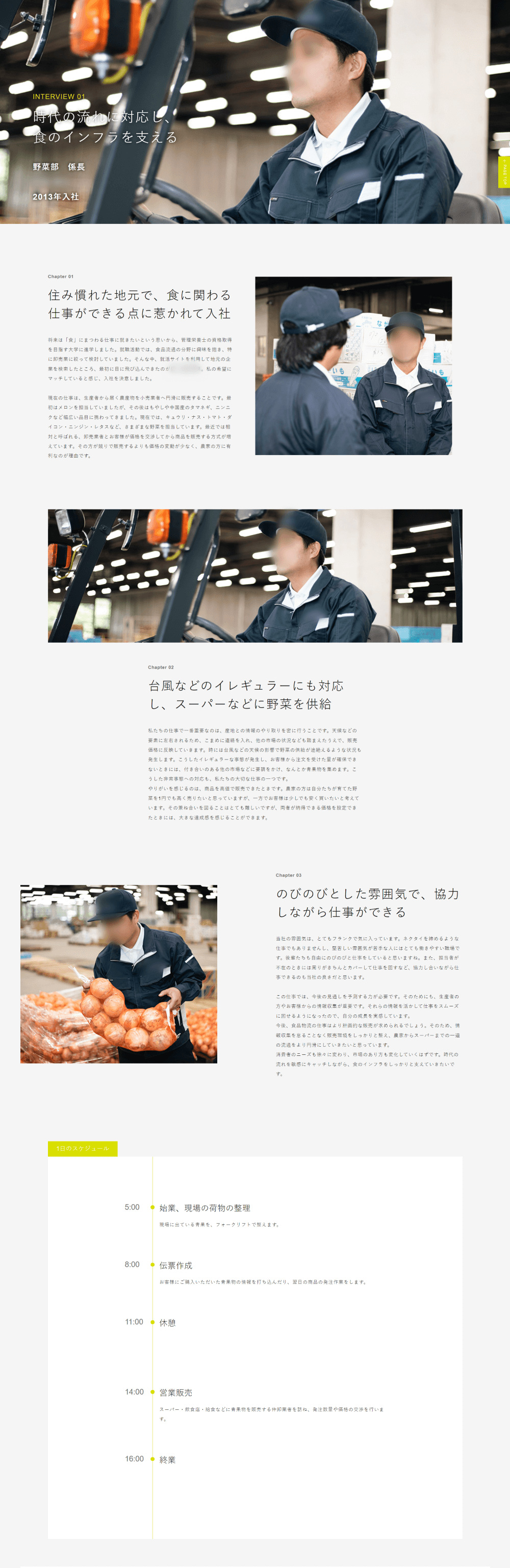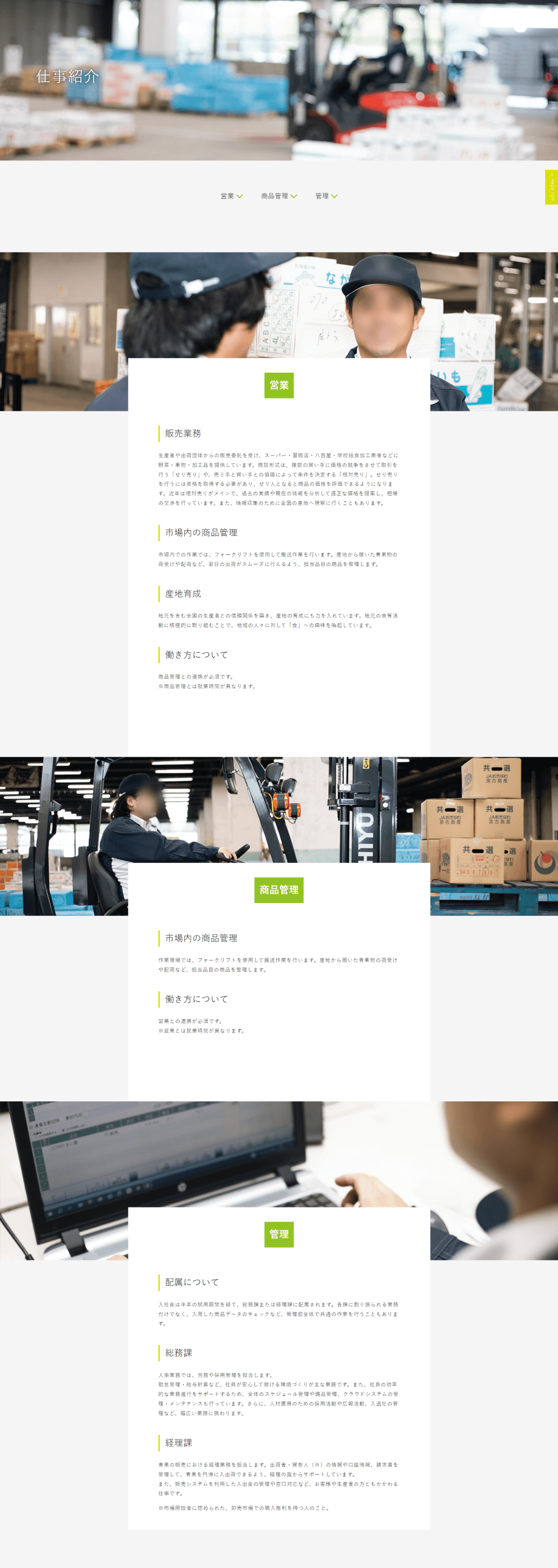 企業ホームページのリニューアルとして、採用情報に特化したコーポレートサイトを制作しました。 TOPページのデザインを、ラインがページ下部まで伸びていく仕様にし、「食をつなぐ 人をつなぐ」というキャッチコピーとシンクロさせました。