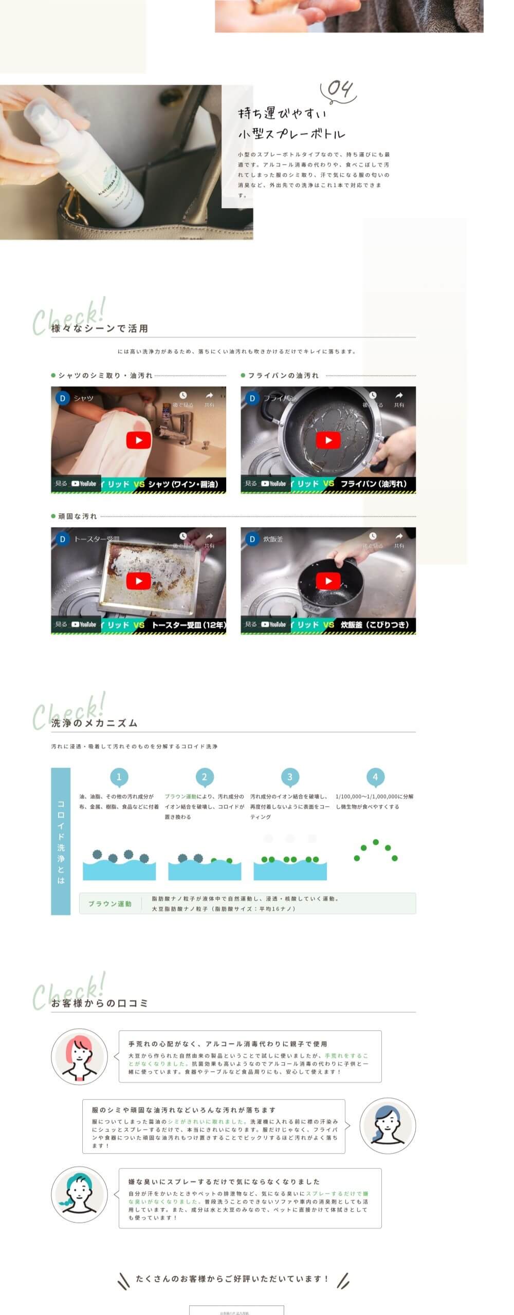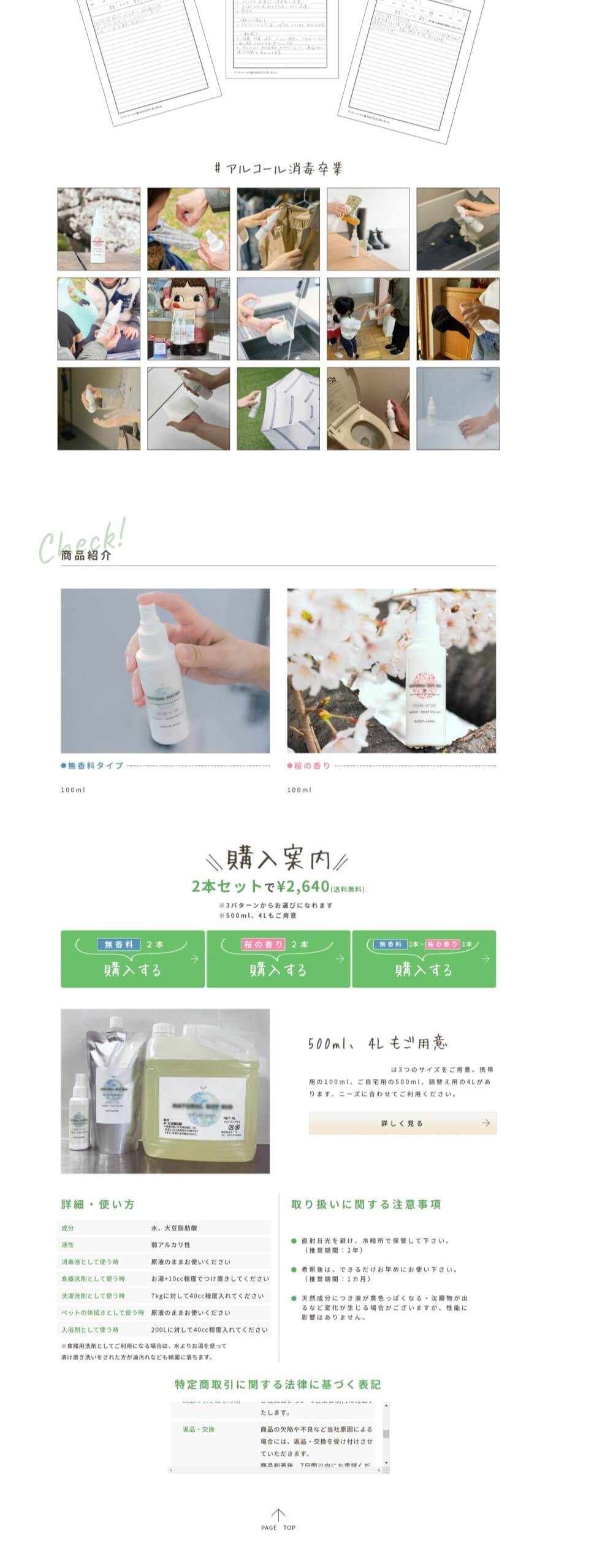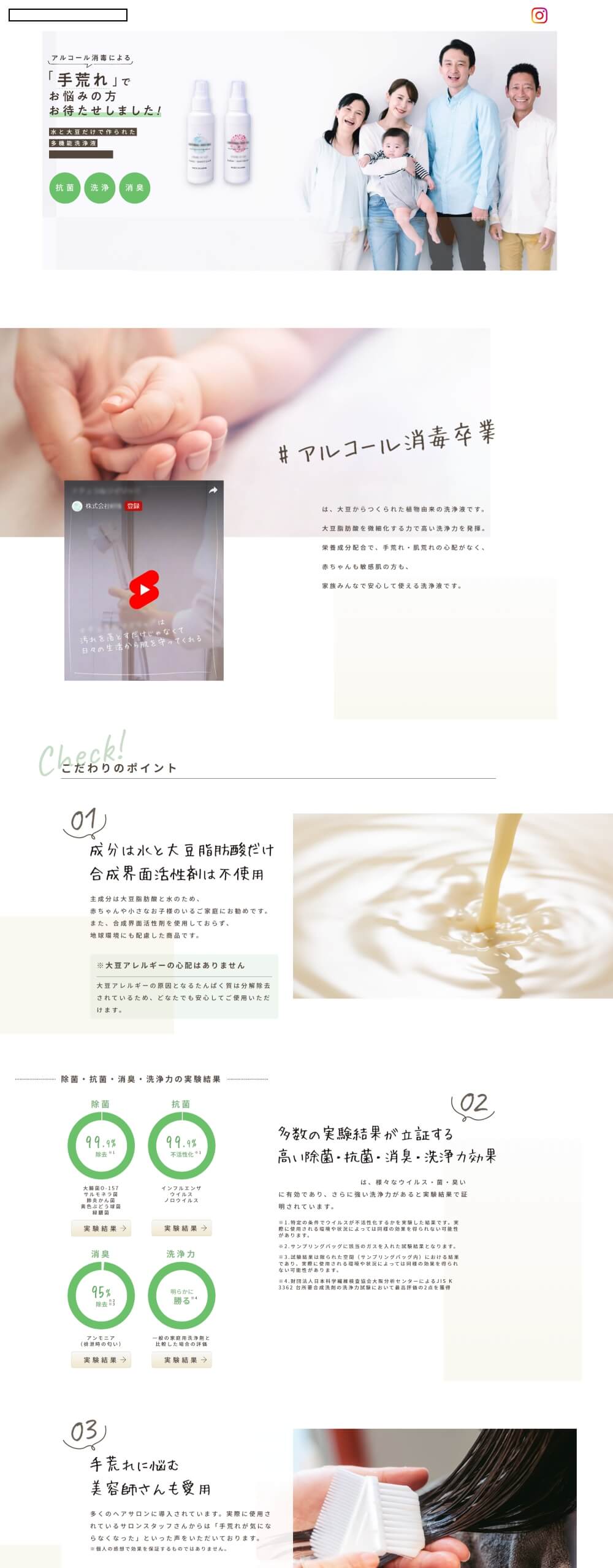 20代・30代の女性(子育て世代含む)をターゲットに「優しいイメージを与える」デザインで制作。商品が洗浄液で抗菌や洗浄、消臭など幅広い用途で使用できる中、昨今のアルコール消毒の習慣化の観点から「手荒れでお悩みの方」という打ち出しを訴求ポイントにLPを制作しました。流入経路の多くがインスタグラムということもありスマホでの見やすさも意識しています。