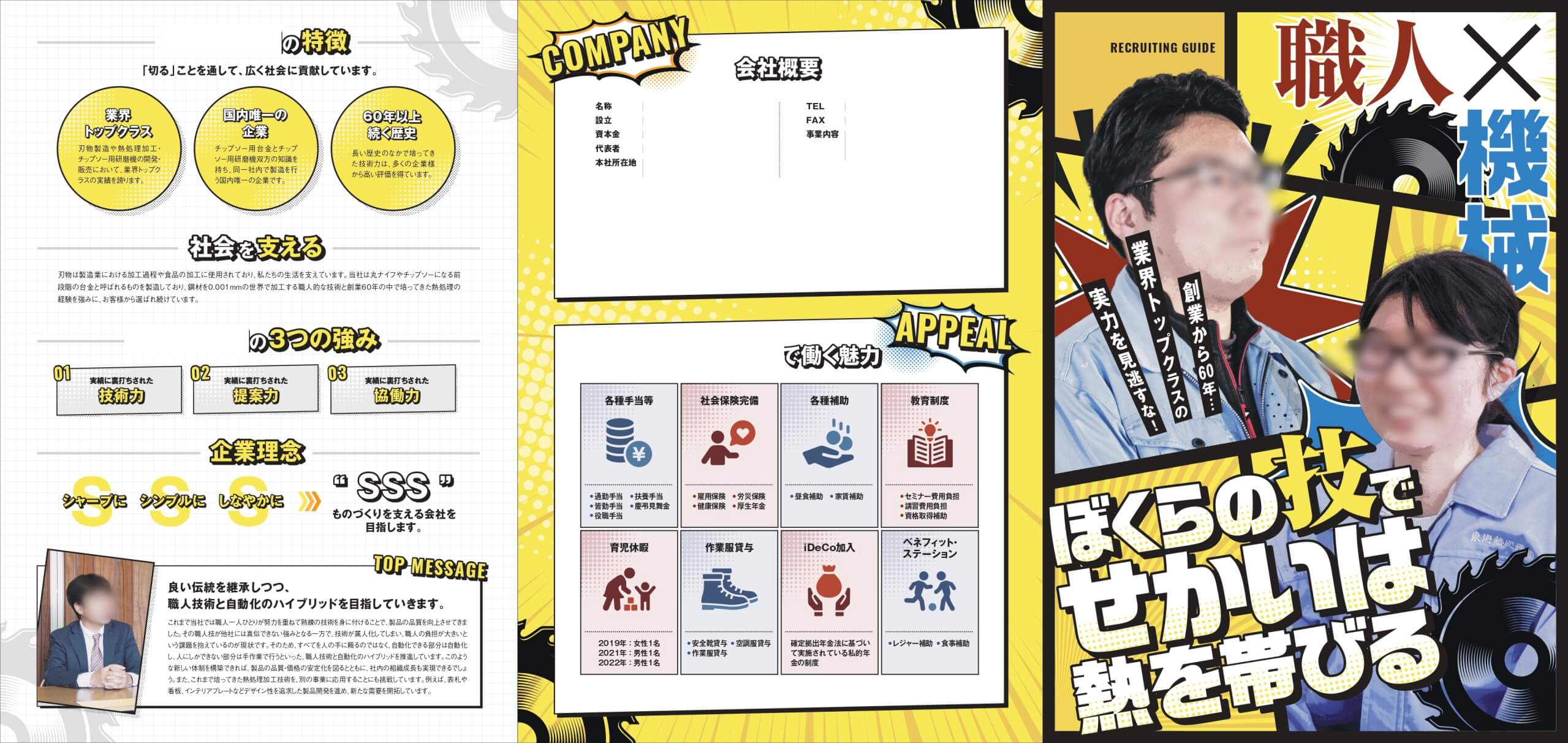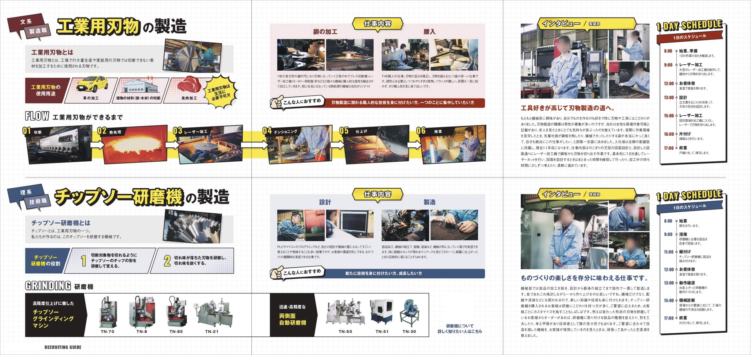 「目を引くものにしたいがポップになりすぎないように」というご要望を受け、トーンを抑えて少年漫画風のデザインテイストにしました。併せてキャッチコピーも少年漫画風にし、刃物のかっこよさが伝わるようなパンフレットとなっています。