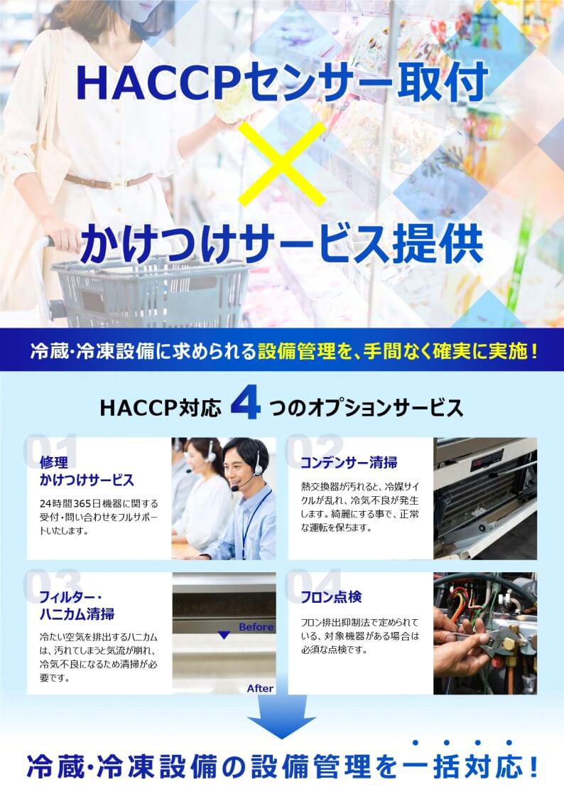 冷蔵・冷凍設備メンテナンスの営業チラシです。お客様の事業を商品にオプションとして付けることで、同様の商品を提供する会社との差別化を図っています。協業していることを強調するため、販売元の企業と共通のコーポレートカラーを用い、表ページ上半分を使用して商品・サービス内容を記載しました。企業名を大きく出すことはできないものの、事業内容を知ってもらいたいという要望があったため、裏面下記に事業内容を記載し、チラシを見た方がアクセスしやすいようにHPへのQRコードも掲載しました。
