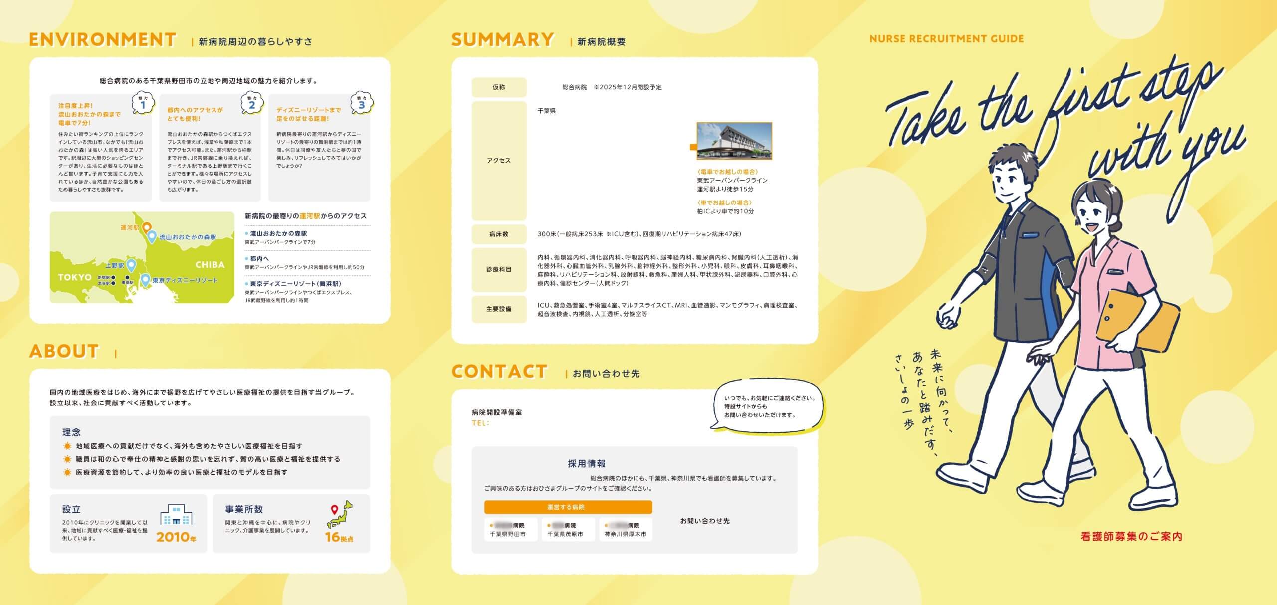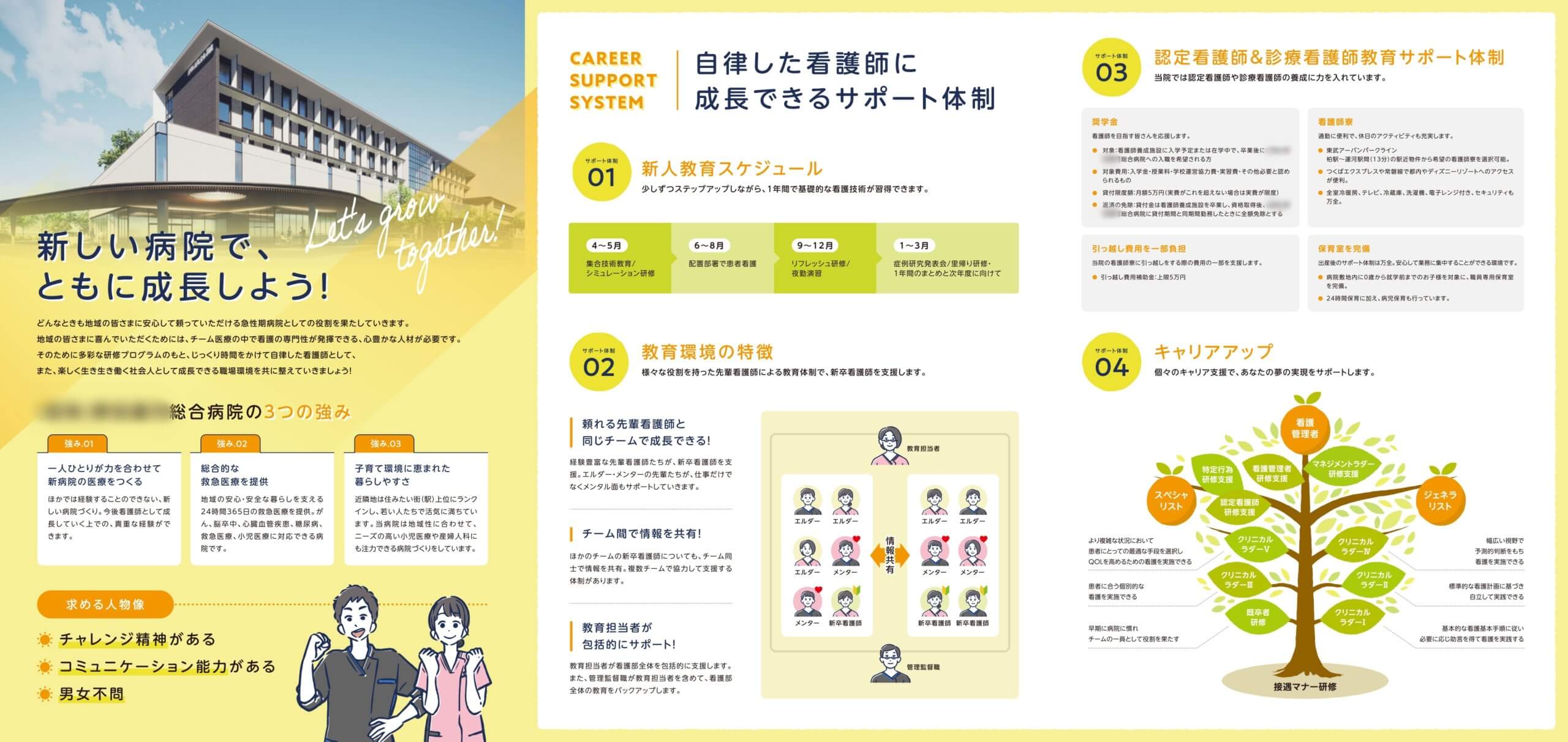 病院や病院周辺の地域の特徴、福利厚生を掲載することで、学生はもちろん、親御さんも安心できる内容としました。