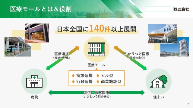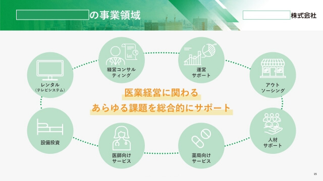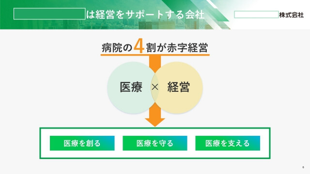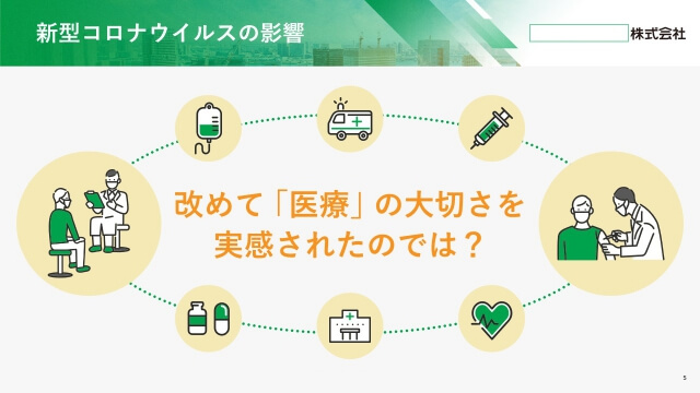 Youtubeでの会社説明会のライブ配信用に既存のパワーポイントをブラッシュアップしました。オンライン用として画面越しに配信を見ている方がわかりやすいように、アイコンと見出し、フォントサイズを大きめに使用しています。医療分野のみならず、時代に合わせて進化し続けている企業らしく、爽快で先進的なデザインに仕立てました。