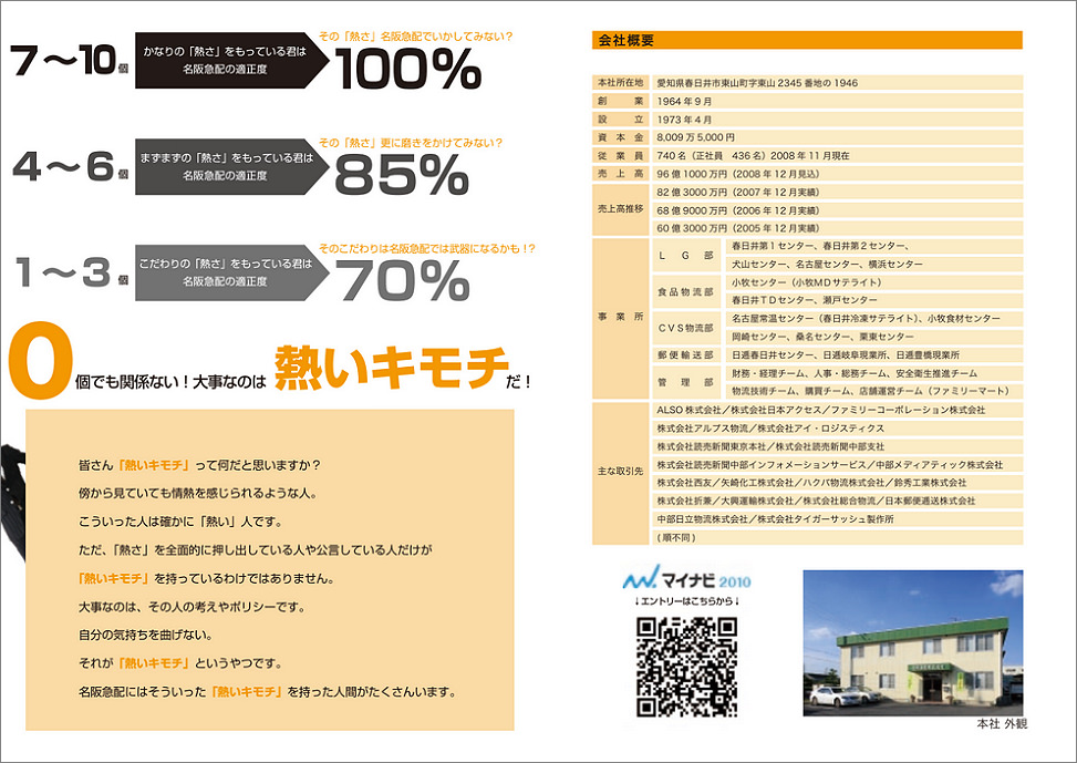 新卒採用パンフレット。合説用では血液型診断ならぬタイプ別適正診断ガイドブックにし、どんな人でもチャレンジできる環境がある事を伝え、説明会用では徹底して働く人の「熱い想い」を表現し、求める人物像のハートに訴えかけるようなものに仕上げました。