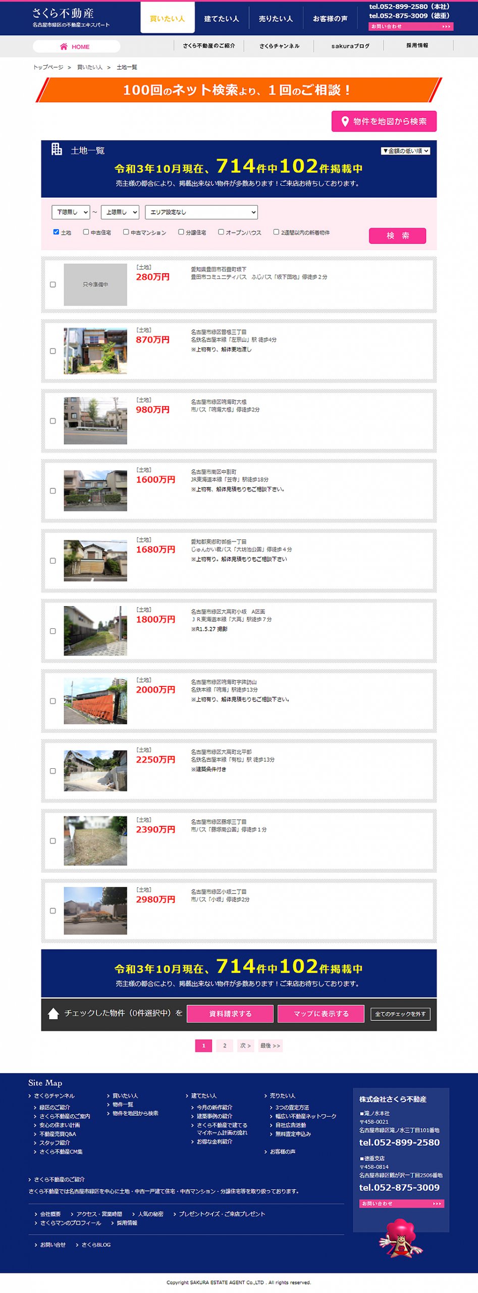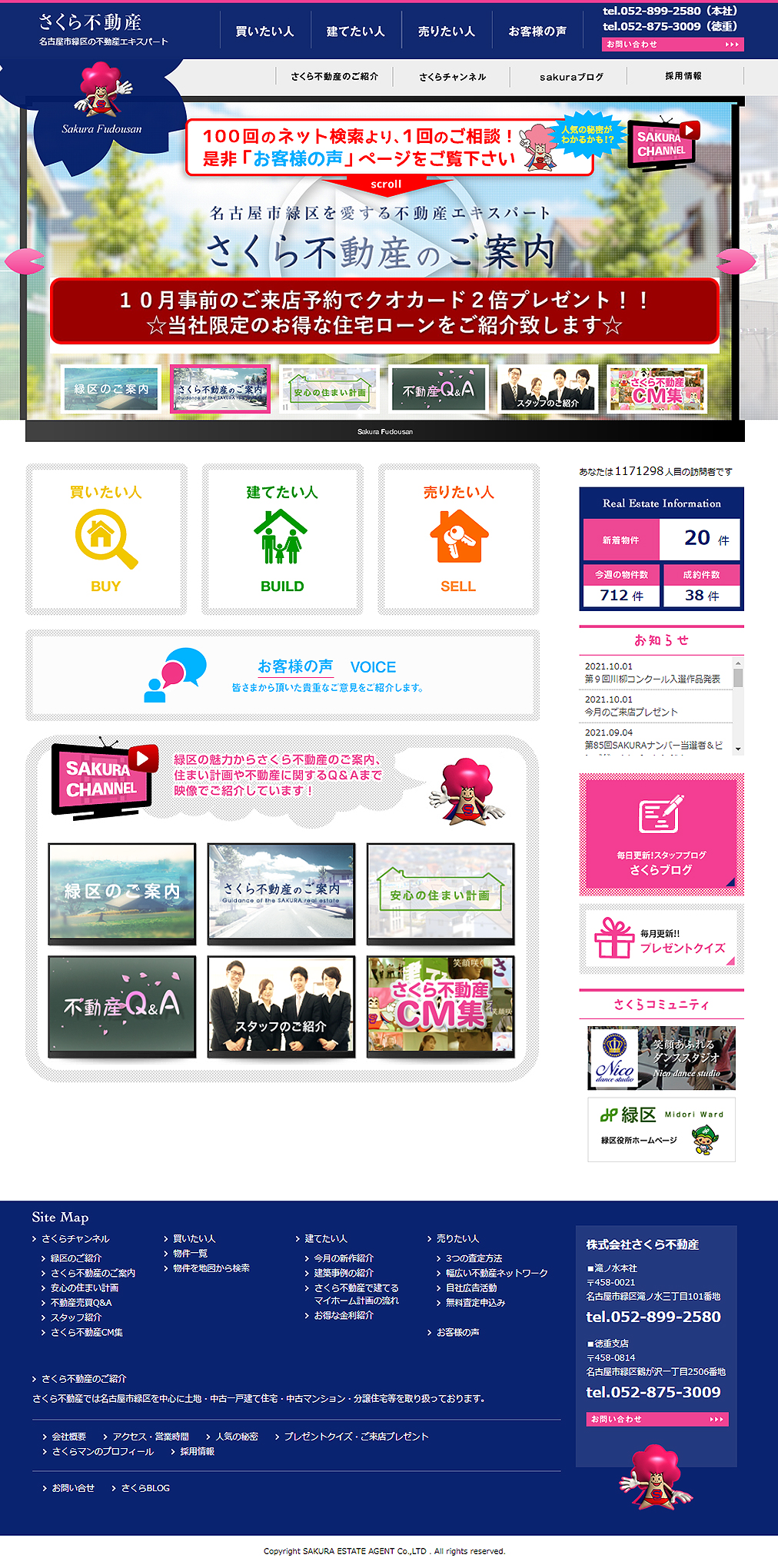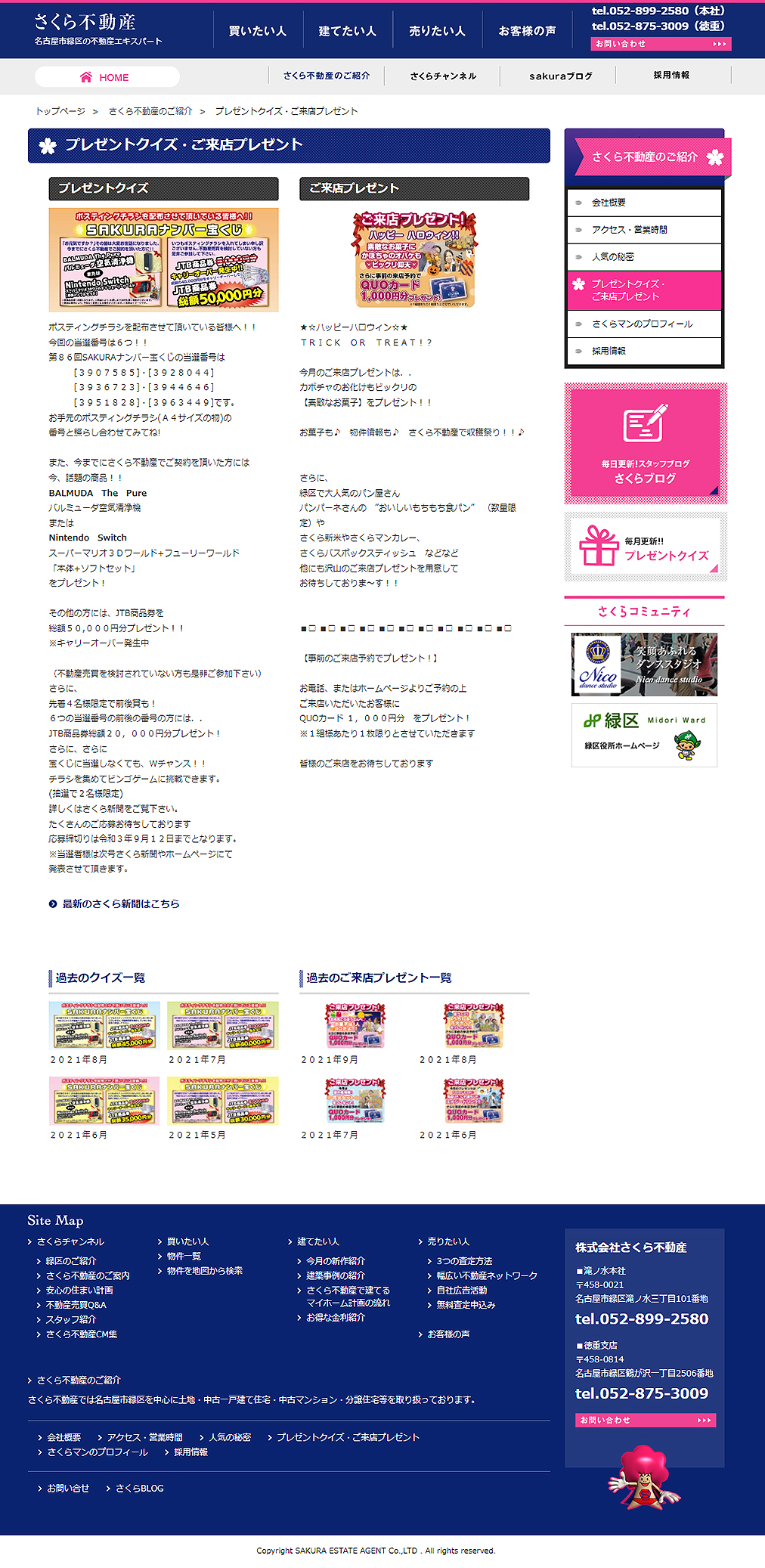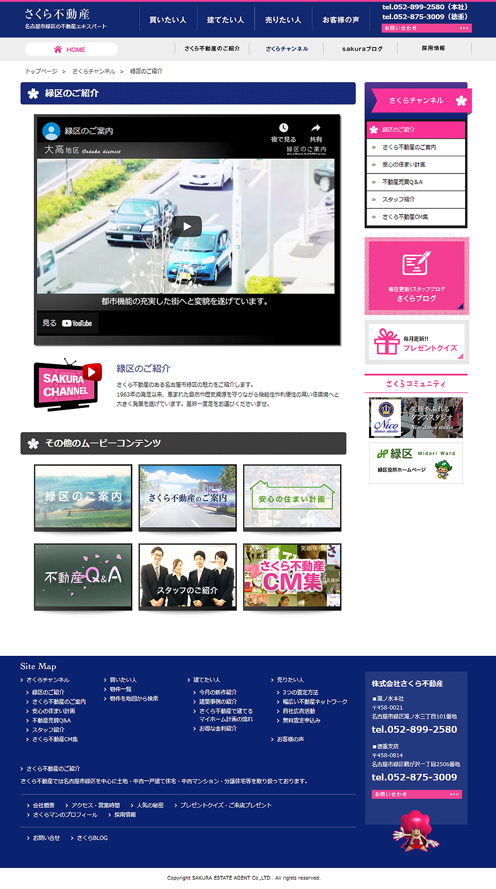会社のキャラクターを活用し、親しみやすい雰囲気のWEBサイト。不動産の検索機能に加え、プレゼントクイズの情報など、ユーザーに嬉しい機能やコンテンツを多く揃えています。また、会社の紹介や主要展開地域の紹介など、多くの動画コンテンツがあることも特徴です。
