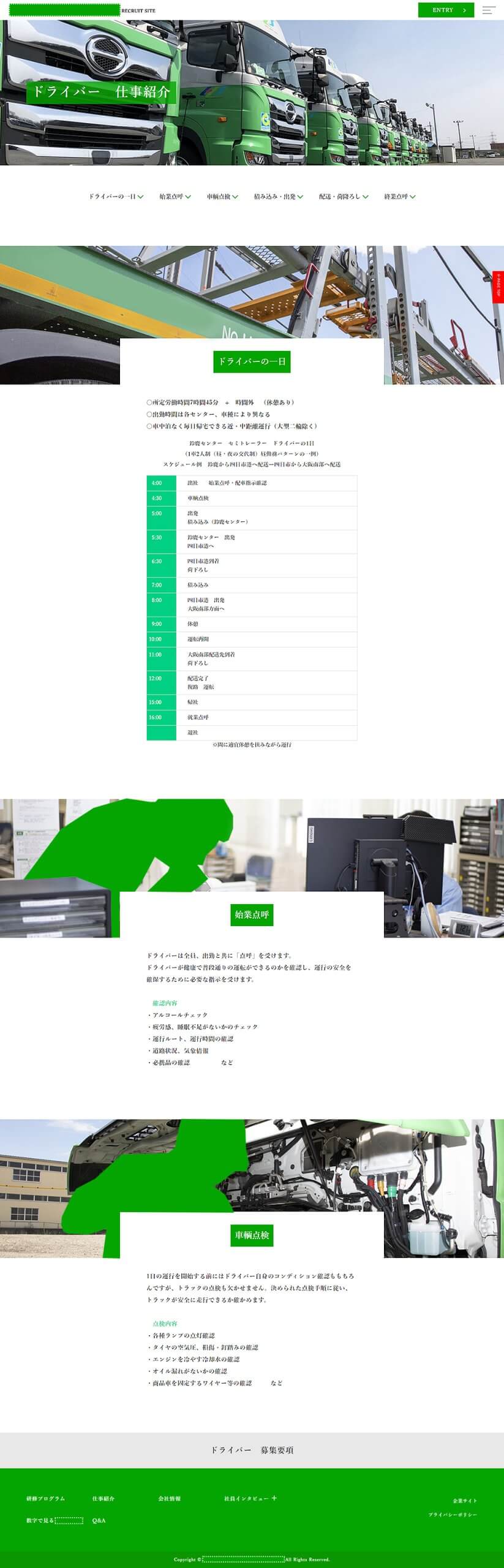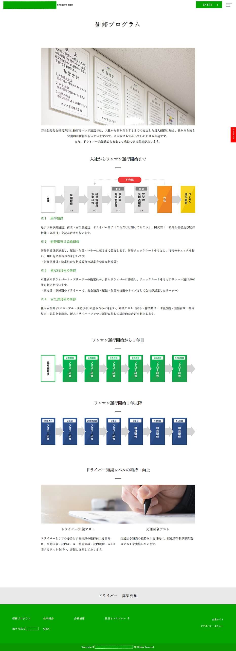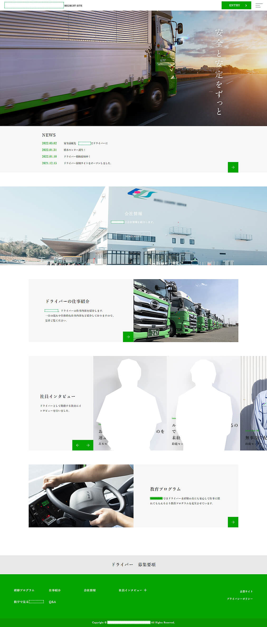 採用難である業種で、未経験者もターゲットになっているため、仕事内容を具体的に紹介するコンテンツや教育プログラムを紹介するコンテンツを掲載し、求職者にわかりやすく企業理解を働きかけました。サイトのデザインはロゴデザインに合わせ緑をファーストカラーにし、赤を指し色としました。画像は基本的にプロカメラマンによる撮影素材を使用しています。