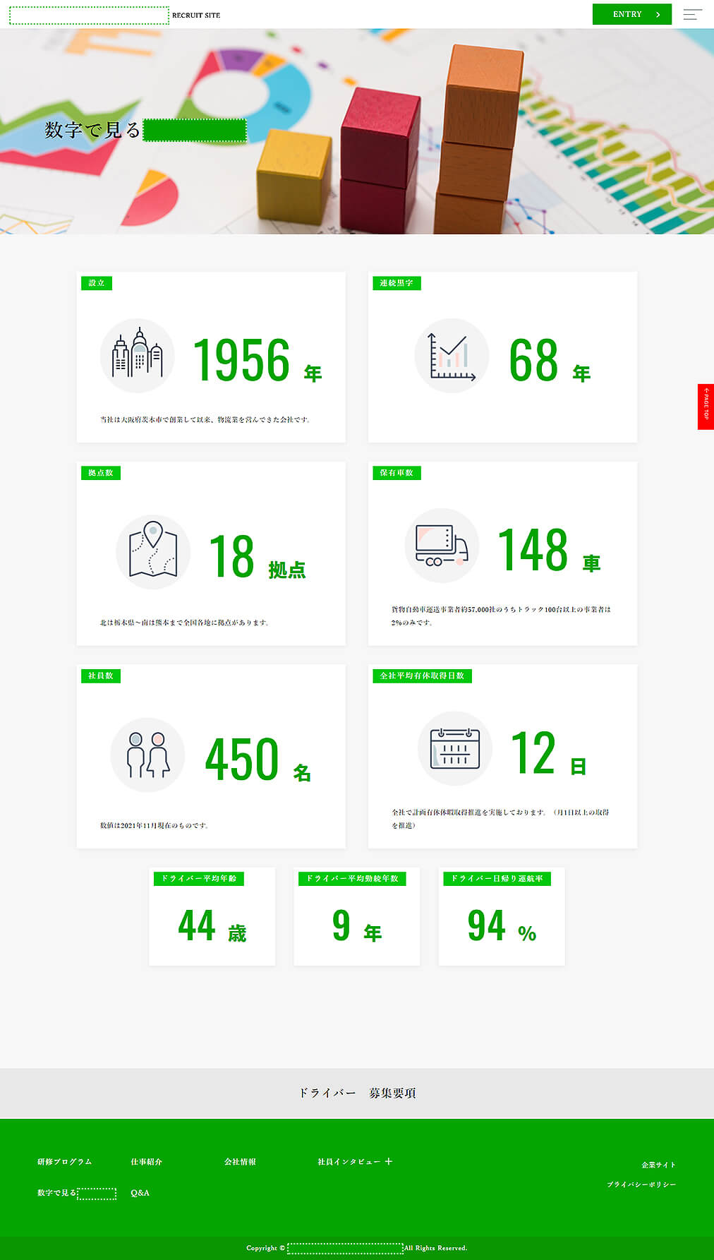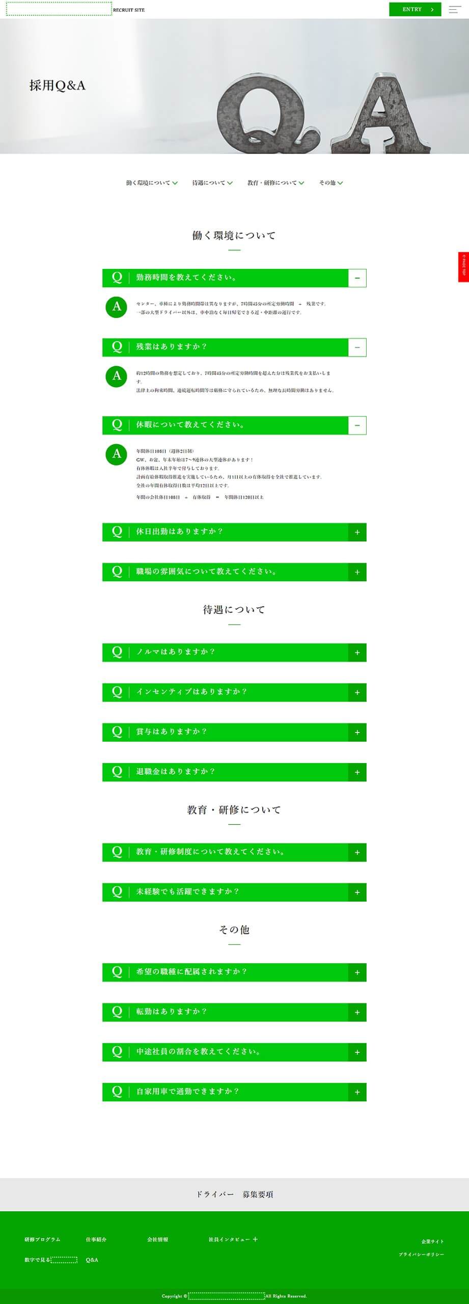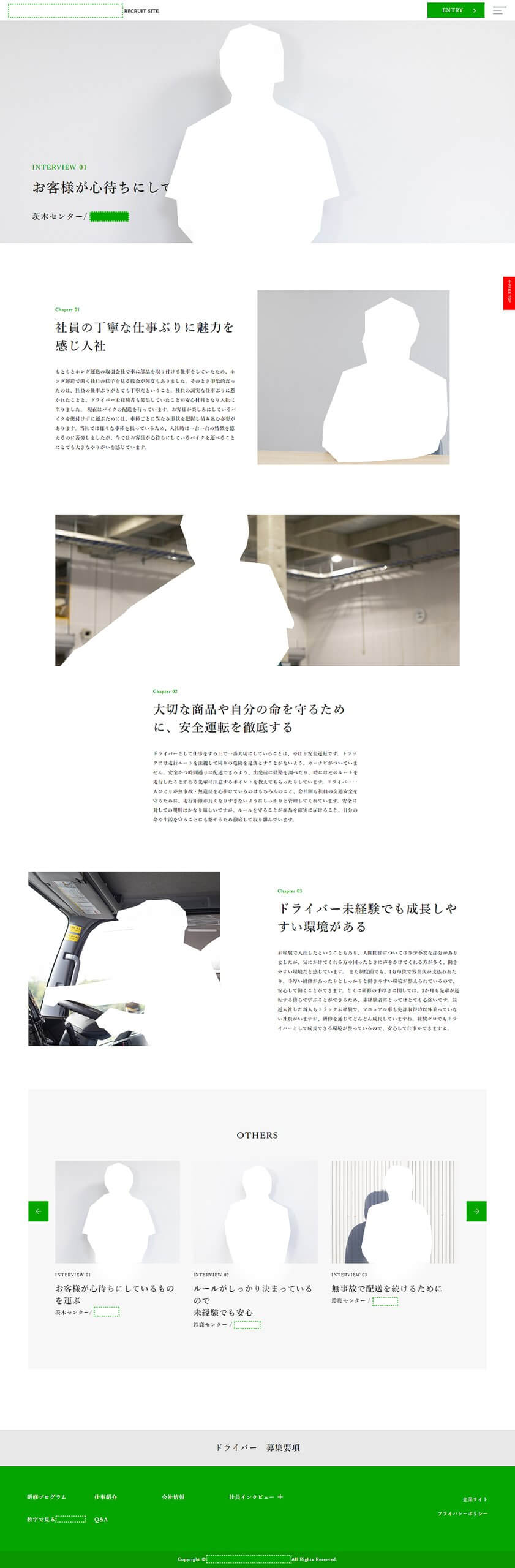 採用難である業種で、未経験者もターゲットになっているため、仕事内容を具体的に紹介するコンテンツや教育プログラムを紹介するコンテンツを掲載し、求職者にわかりやすく企業理解を働きかけました。サイトのデザインはロゴデザインに合わせ緑をファーストカラーにし、赤を指し色としました。画像は基本的にプロカメラマンによる撮影素材を使用しています。