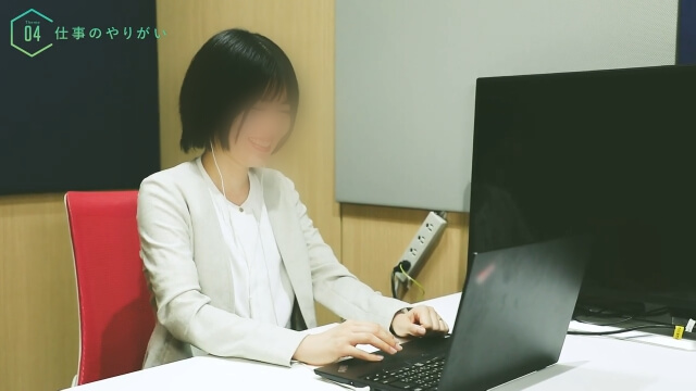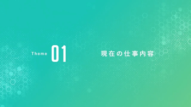 採用動画パッケージ「ミテシル」を使用した社員インタビュー映像です。企業ロゴのトンマナと、製薬や研究開発に関わる事業内容に合わせて、「理系」イメージの装飾を使用しました。入社のきっかけ~今後の目標まで幅広くインタビューすることで動画を見る方に働くイメージを醸成します。