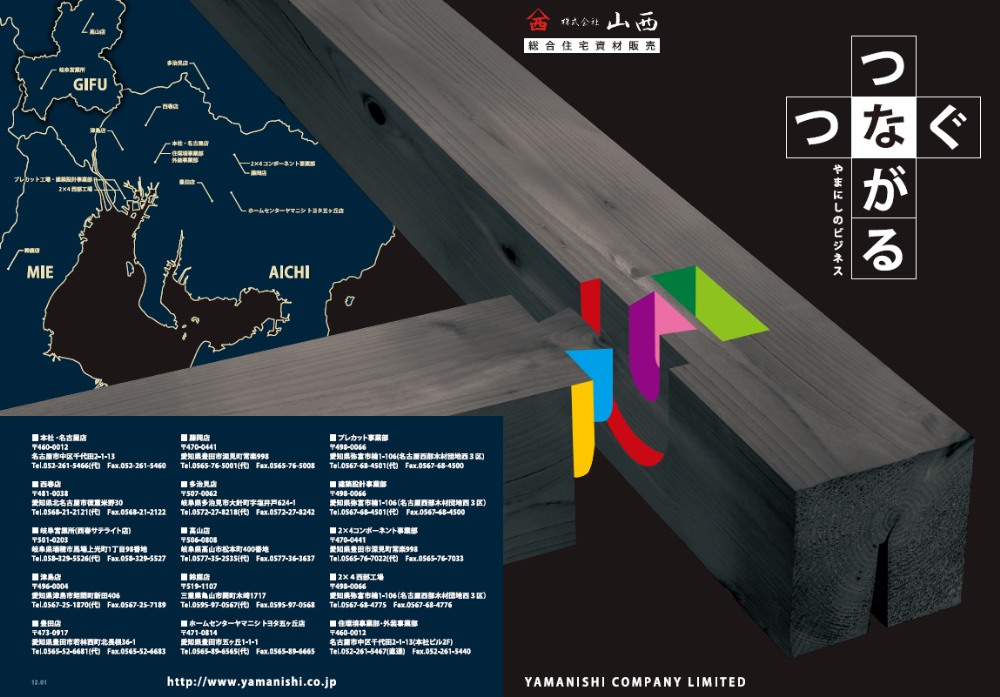 住宅資材を総合的に販売される山西様の採用パンフレットを作成させていただきました。仕事内容が社員インタビュー等を通じ、わかりやすく解説されている白いパンフレットと、山西様の事業内容をマトリクスや画像を使い解説した黒いパンフレットの2部構成です。配布対象者に応じて、どちらか片方または両方を配り、同社に対する理解度を深められるようお打ち合わせを繰り返しながら、丁寧に創らせていただきました。